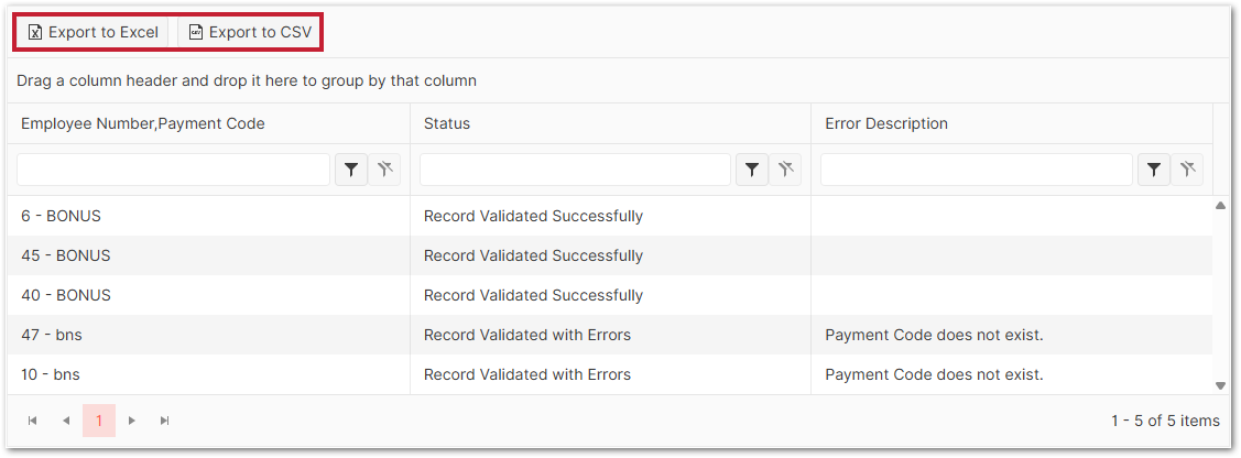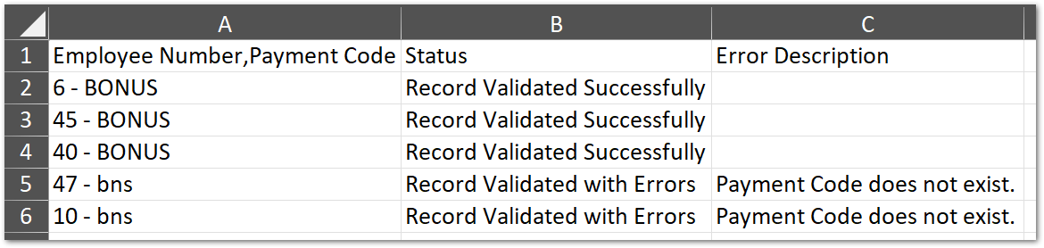 - Continue with Upload - all successful records in the template will load into the system and add the payments to the employees' current payroll, whilst all unsuccessful ones will not