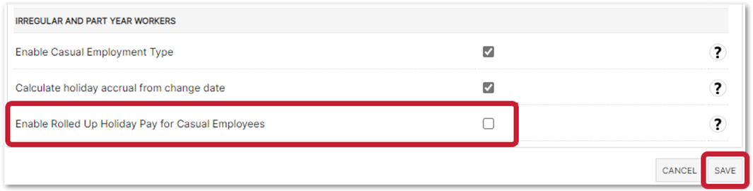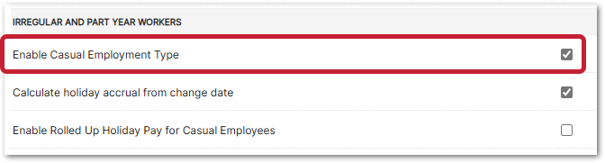 - Scroll down to 'Irregular and Part Year Workers', tick the box against Enable Casual Employment Type and then Save
