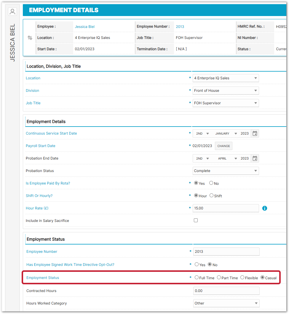 - Change the Employment Status from Flexible to Casual, scroll down, and Save