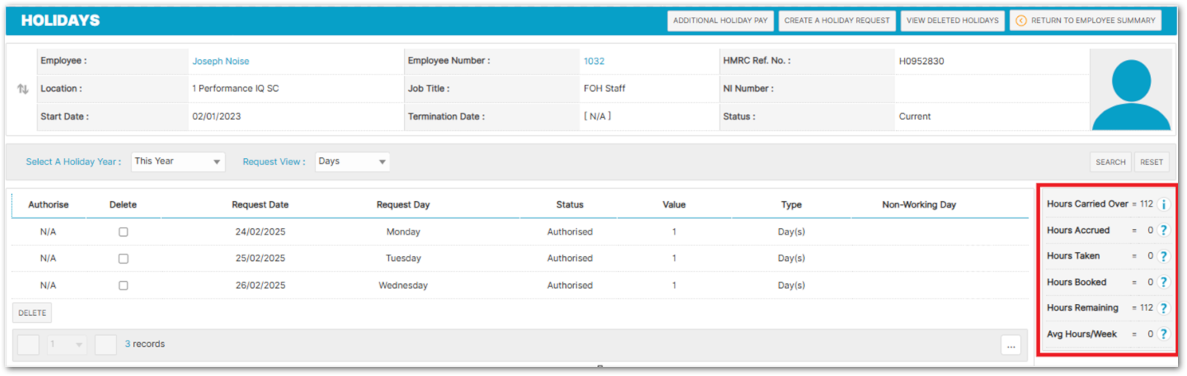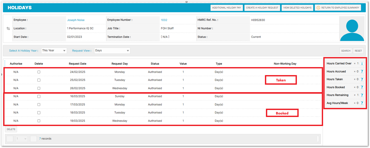 Please see the example below of a flexible employee. They have already taken 3 days of holiday and have 4 days booked.