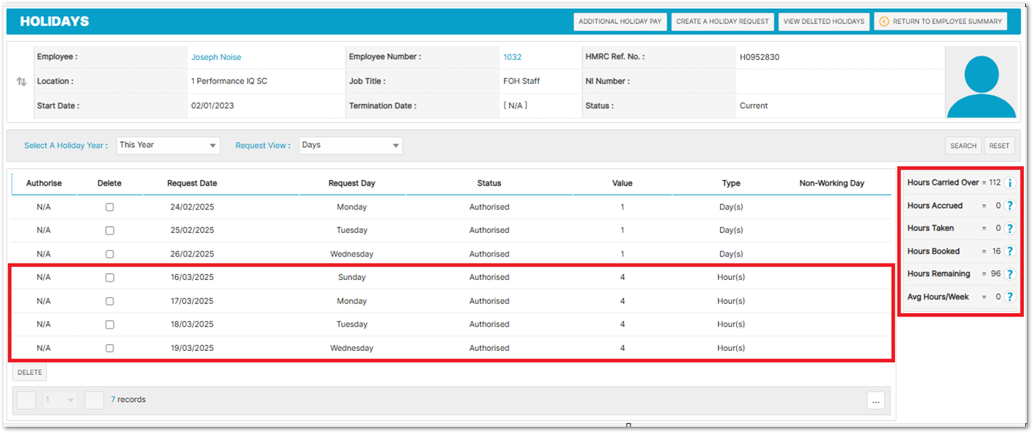 Any future holiday already booked in days for after the employment type change needs to be deleted and rebooked in hours once the employment type change has been completed - see 'Step 6'