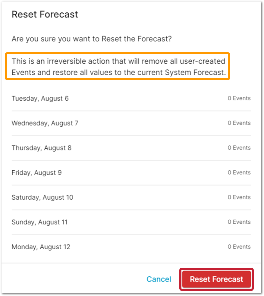 When selecting Reset Forecast, a prompt will indicate that the forecast values will be reset to the current system forecast values.