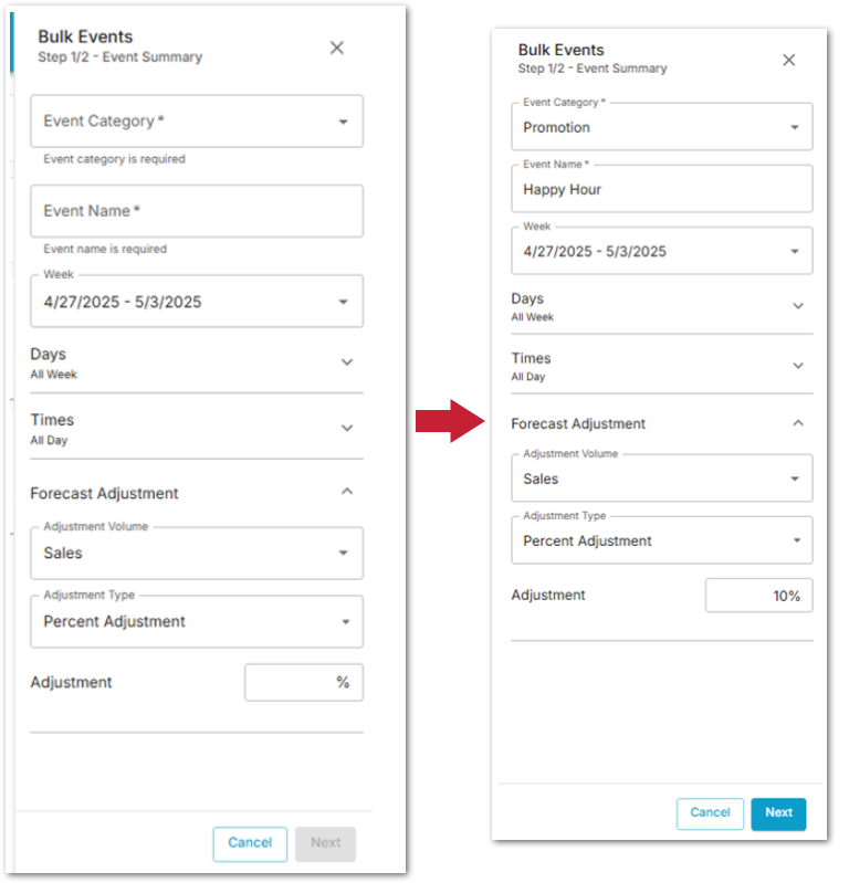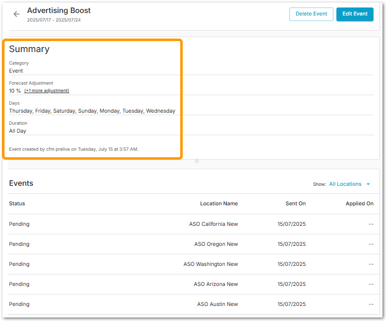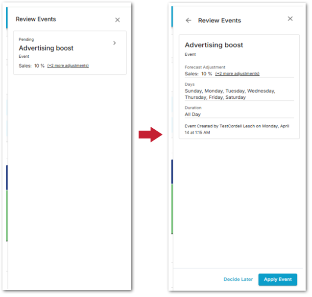This lets location managers decide whether to apply the bulk event’s proposed adjustment to their local forecast.