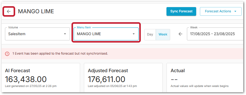 When using the filters on the main Forecast dashboard and selecting 'Sales Items' or 'Menu Items', an alternative view is shown.