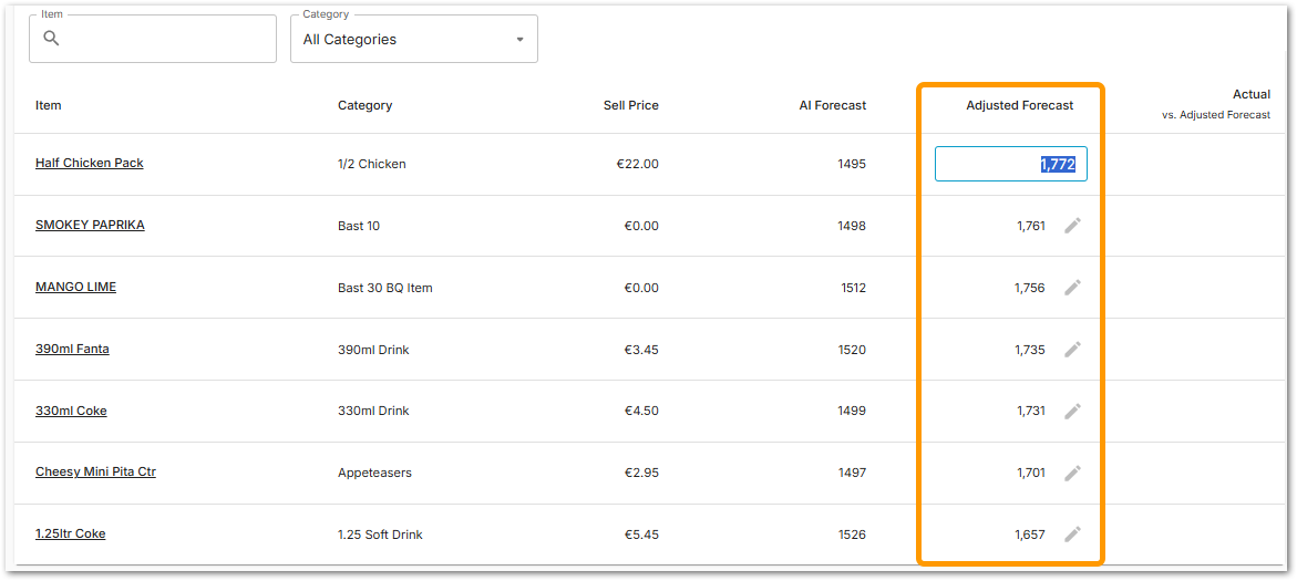 A table beneath the filters, containing the aggregated forecast information of sales/menu items provides a quick reference point of the forecast information (see Fig.2). The table has columns for the menu 'Item' name, 'Category', 'Sell Price', 'AI Forecast', 'Adjusted Forecast' and 'Actuals' (if applicable).