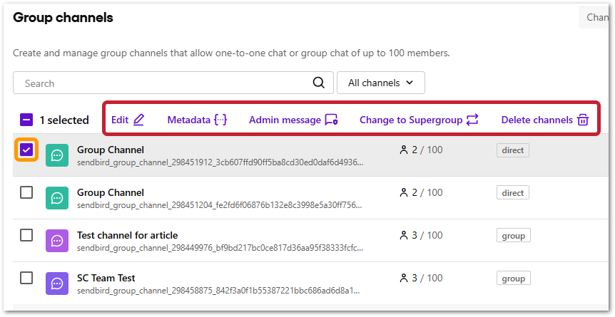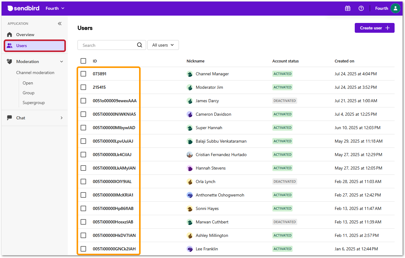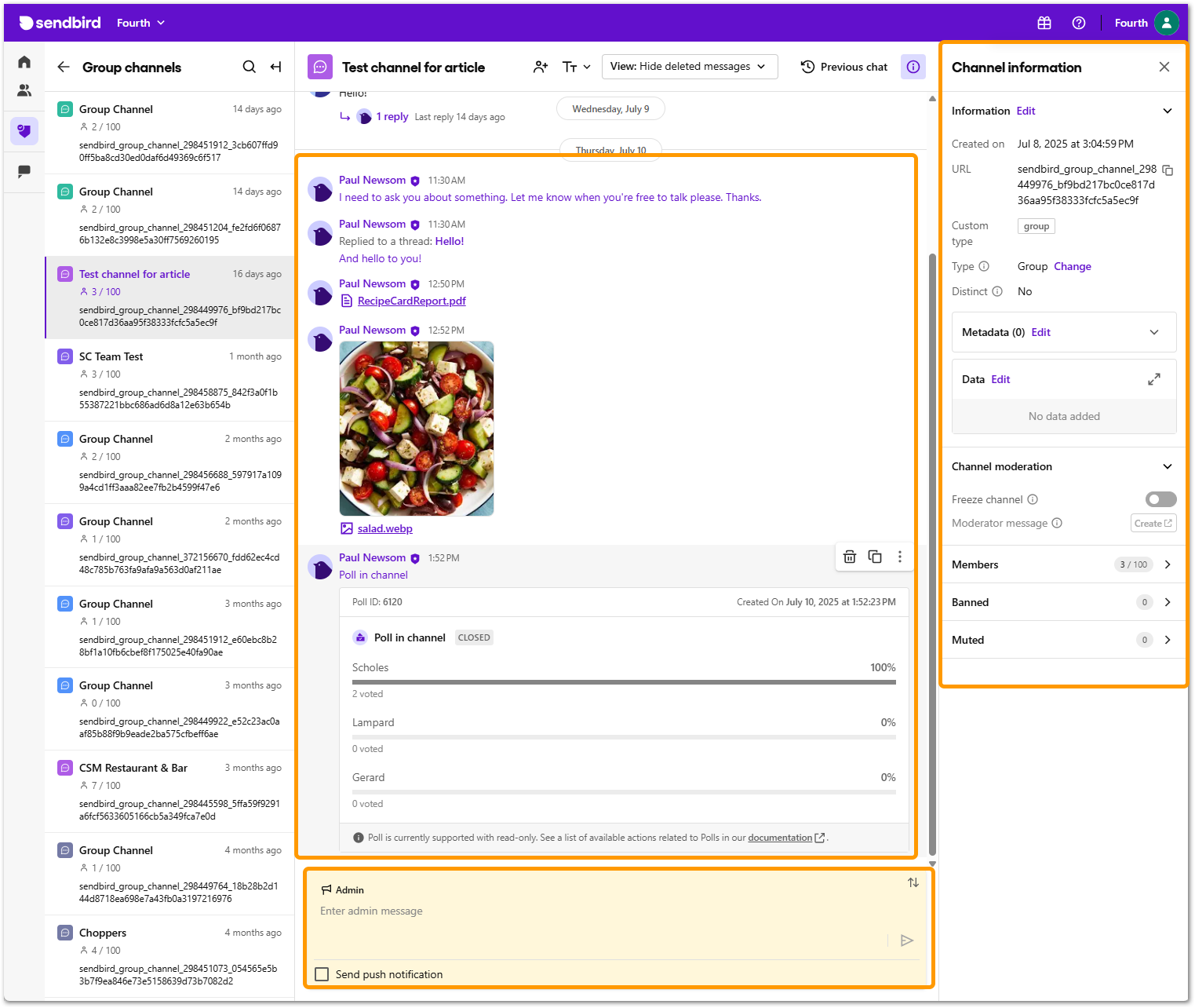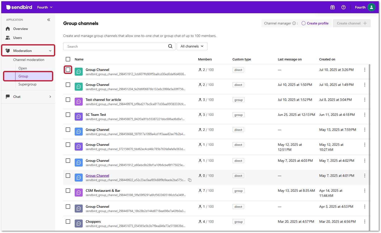 Fourth's Messaging application is administered via a dashboard provided by 'Sendbird'. Admin users are able to monitor all open and group channels, delete threads, images, and conversations, and generally moderate the content.