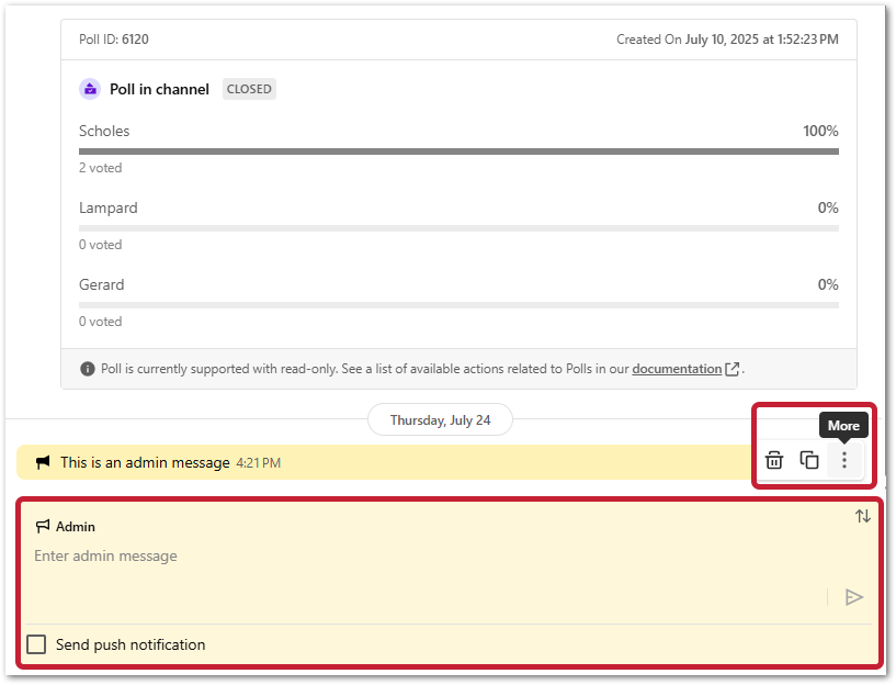 - To edit, copy (text or URL), or delete a posted admin message, hover over it and use the tooltip options as required