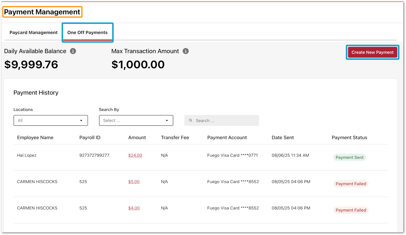 The 'One-Off Payments' feature allows customer administrators with specific permissions to execute single payments to your employees directly from the Fuego Admin tool. Payments can be sent to a Fuego Prepaid card, bank account, or external card (if available), within the payment limit. This provides flexibility for customers to make ad-hoc payments outside of regular payroll cycles, with enhanced control, reporting, and payment method options.