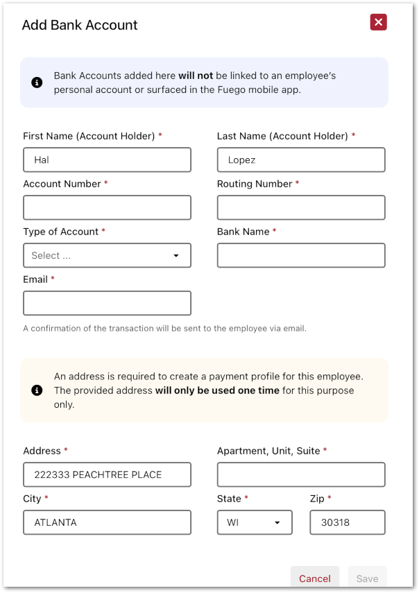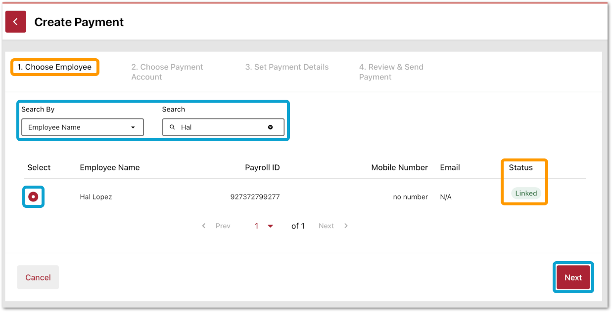 If their status is 'Linked', this means the employee has registered with Fuego and there may be at least one Payment Account available to select in the next step. If the employee is 'Not Linked', or they haven't added a payment method, you will be prompted on the next step to add their bank account details