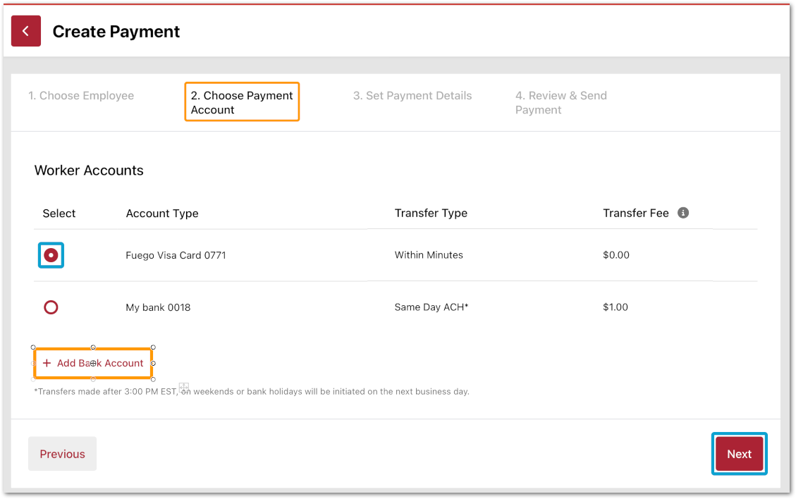 - Step 2: Select a payment account - these are the payment methods that the employee has added in their Fuego mobile app. It is advisable to confirm with the employee ahead of selecting the payment method which is their preferred option.
