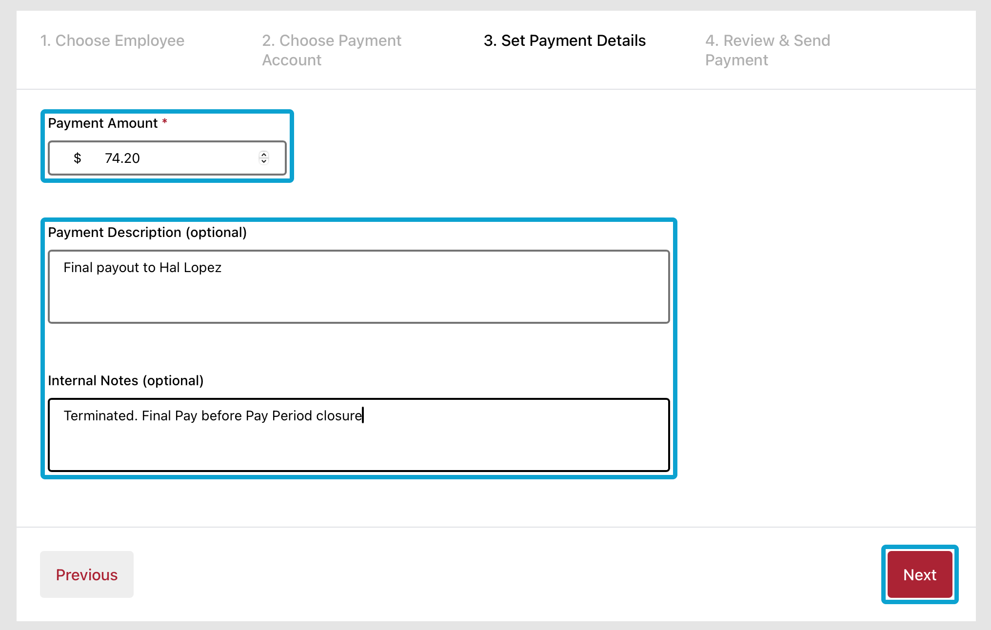 - Step 3: Enter the Payment Amount (validated against limits) and an optional Description, and Internal Notes