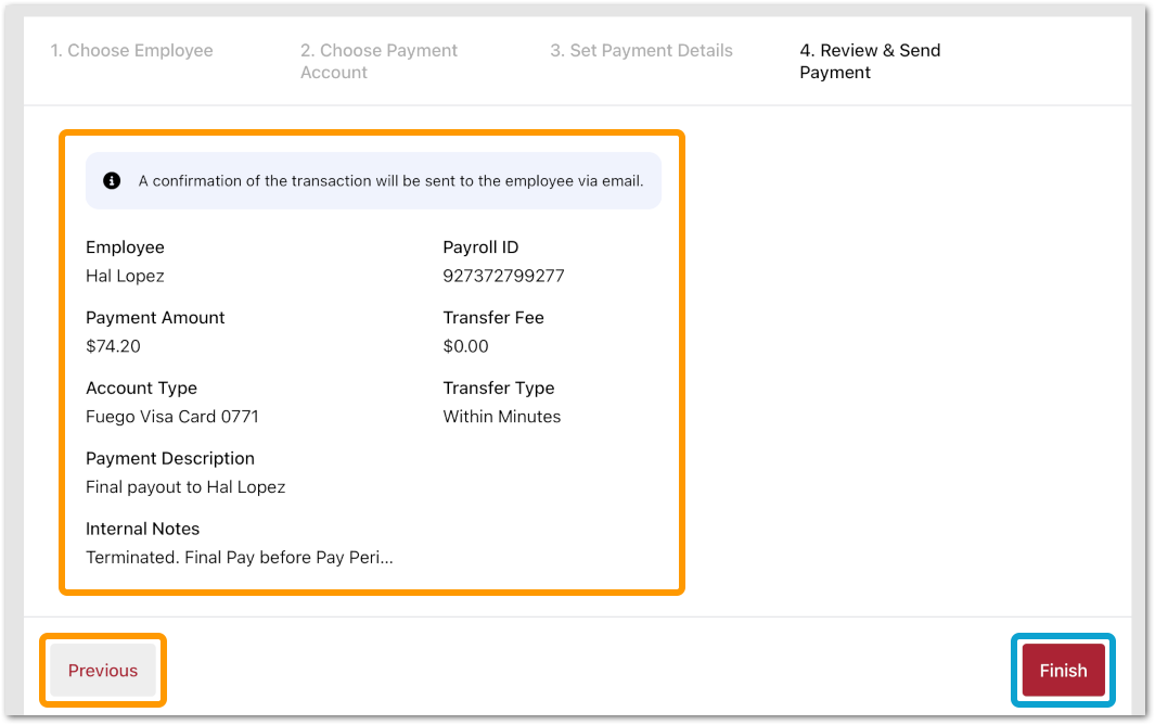 - Step 4: Review details, accept agreements, and select Finish to send payment