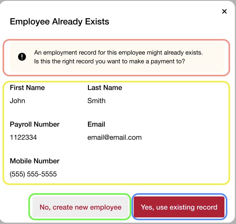 Upon entering all details and clicking Save a check will be performed if the provided information matches any other employee within the organization.