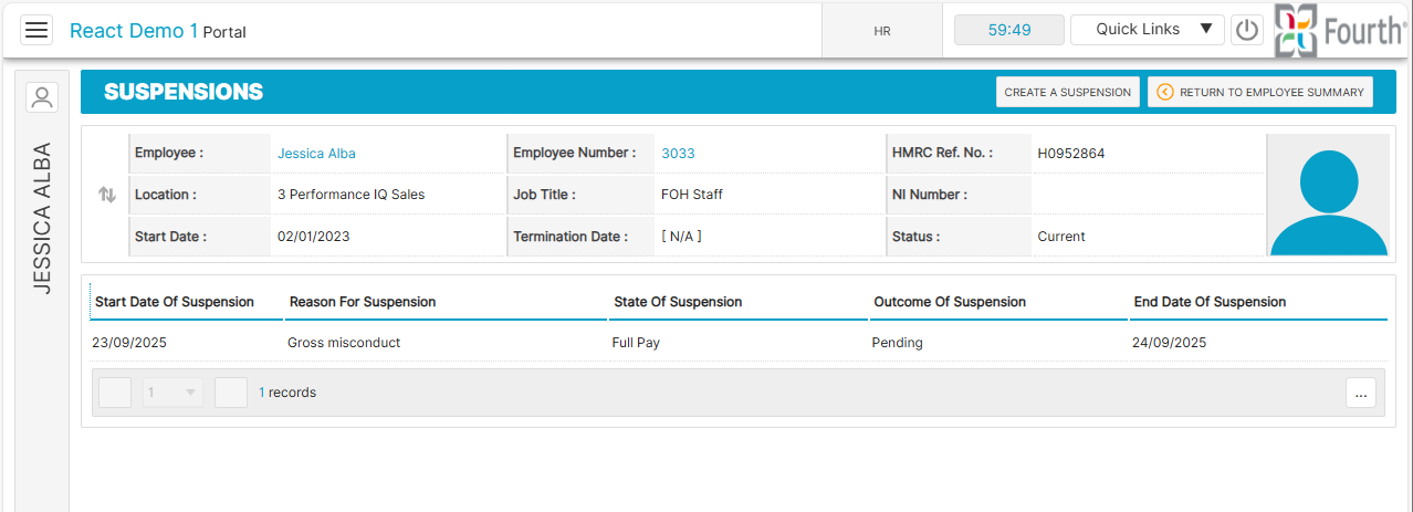 - With the employee in question selected, use the employee side menu and go to HR > Employee HR Info > Suspensions
