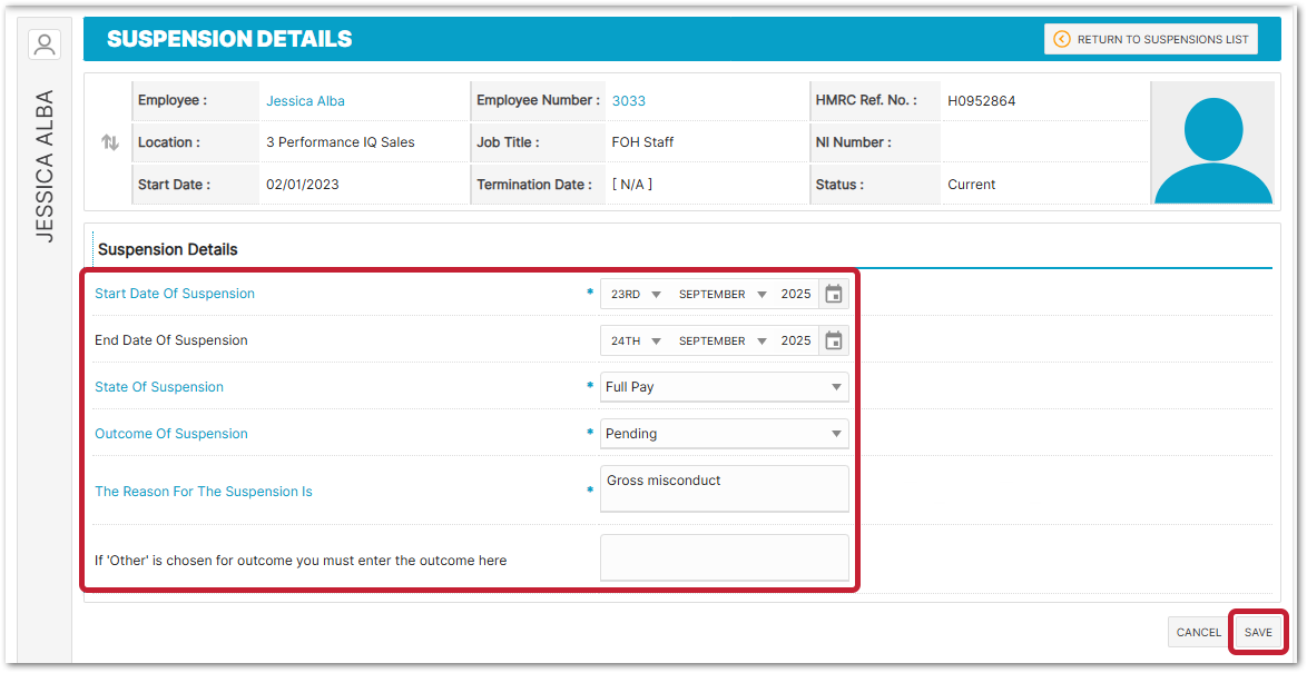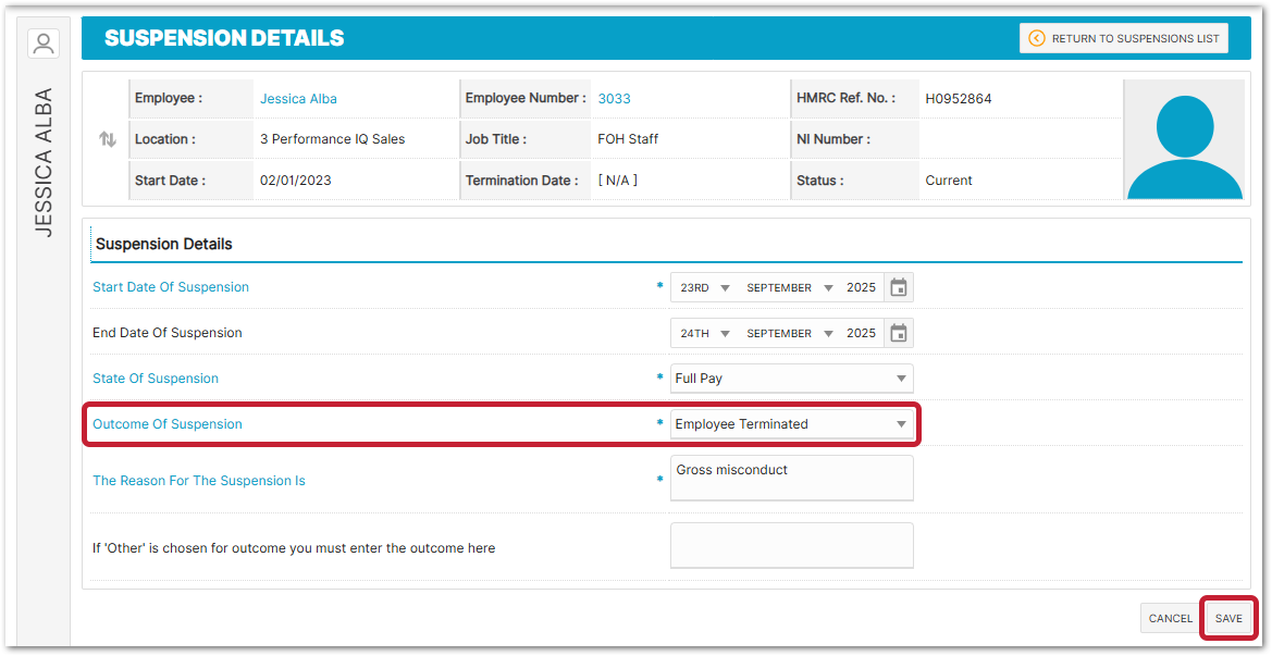 - Change the Outcome of Suspension to Employee Terminated and then Save