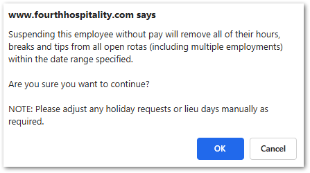 - Suspending this employee Without Pay will remove all of their hours, breaks and tips from all open rotas (including multiple employments) within the date range specified.