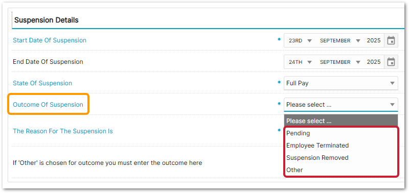 - Outcome of Suspension - this would typically be set to Pending first and then later updated to Employee Terminated, Suspension Removed, or Other - see 'Outcome of Suspension Options' section below