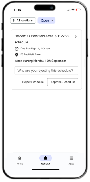 As an area or district manager, you’ll get a notification in the Manager iQ app. From there, you can quickly review the schedule, check key metrics, and either approve or reject it.