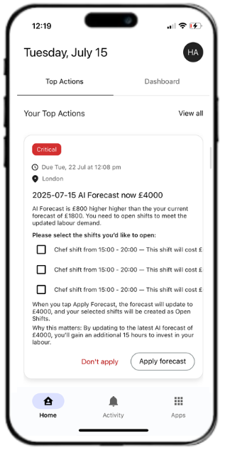 Review the updated AI labour recommendations, including any suggested open shifts and their impact on labour cost. Decide whether to apply the new AI forecast: If accepted, your location will update to use the latest AI forecast. The selected open shifts will be created to meet the updated labour demand. These shifts will be published for employees to view and pick up. If the changes aren’t needed, you can simply dismiss the action in the Manager IQ app.