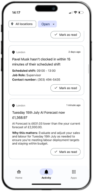 The Manager iQ App has a broad set of workforce-related alerts and actions, providing managers with a single, smart interface to manage key operational decisions quickly and confidently. This covers the full scope from sales and labour alerts, late clock-in alerts to schedule review and approval workflows.