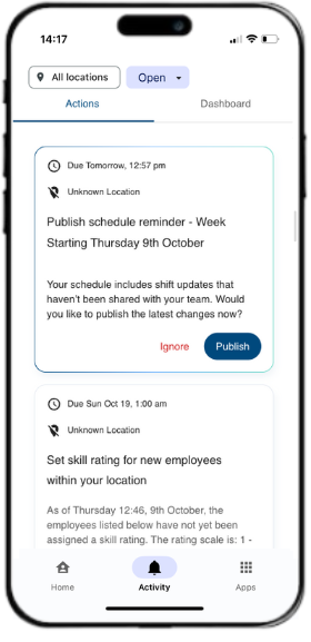 The alert identifies the location and schedule week where updates have been made but remain unpublished. Managers can publish directly from the alert, ensuring all employees immediately see the most up-to-date schedule.