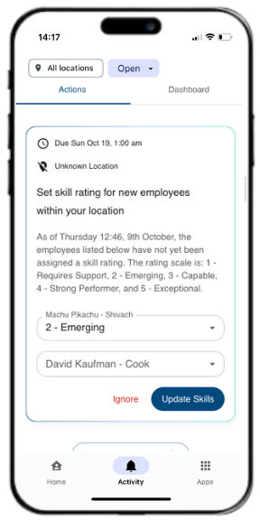 Open the alert in the Manager iQ app, review the employee details, and update their skill score in the system once training or onboarding is complete. Once a valid score is assigned, they’ll be eligible for inclusion in auto-scheduling.