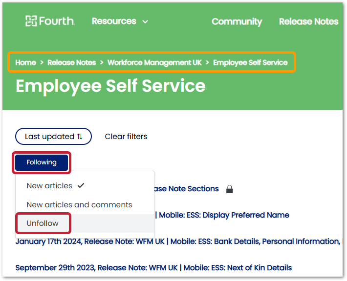 - For each module you do not want to receive release note emails, select Following > Unfollow (see example below for 'Employee Self Service')