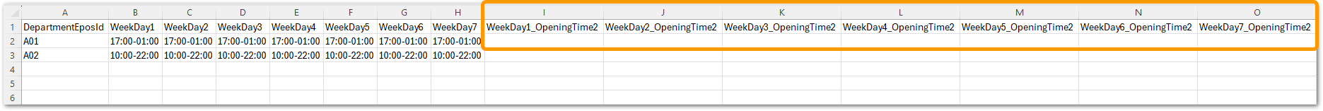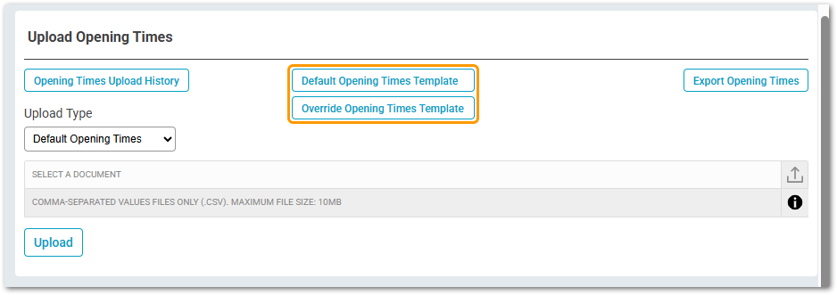 To prepare for changes to the existing 'Upload Opening Times' functionality, seven new 'OpeningTime2' columns have been added to the downloadable file templates. In a future release, this will be used to support multiple opening times for each day at a location (separate opening times for a restaurant and kitchen, for example)Customers must use these template files for uploading opening times, as the new 'OpeningTime2' headers are required for file validation (despite their columns not having any values yet)