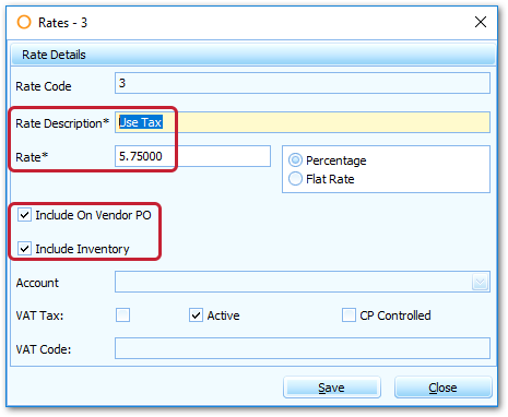 To accommodate this, you can use a combination of two rates that are designed to be used together. These are both added to a Vendor Purchase Order, although the use tax will not be paid to the Vendor.
