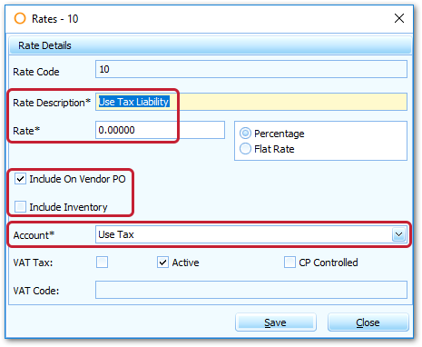 - For this 'liability'rate, again check the Include On Vendor PO box, but uncheck the Include Inventory box and assign the to the applicable GL Account in your financial platform