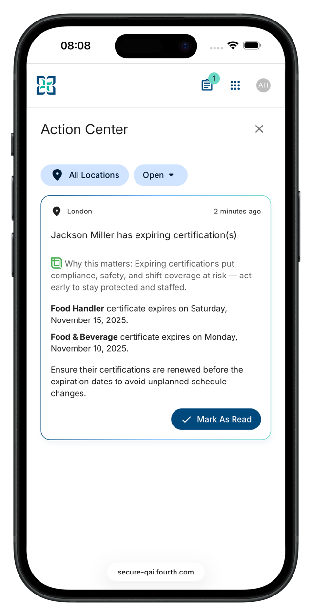 Maintaining active certifications is essential for legal compliance and operational safety. This alert prevents last-minute disruptions by ensuring managers can address expiring credentials before an employee is restricted from working or scheduled in error.