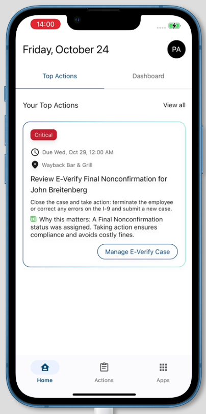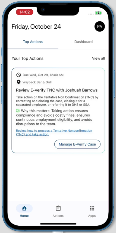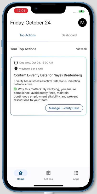 An alert titled “Confirm E-Verify Data” with the employee’s name, location, and a link to their E-Verify case.