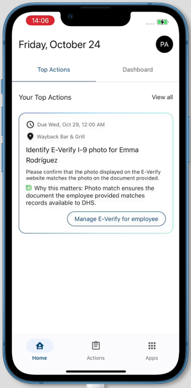 An alert with the employee’s name and a link to view their photo in E-Verify.