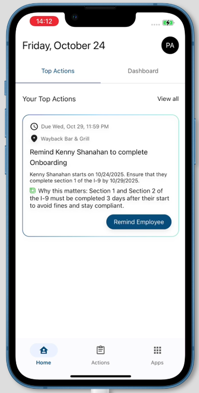 An alert showing the employee’s name, start date, and a Remind Employee button.