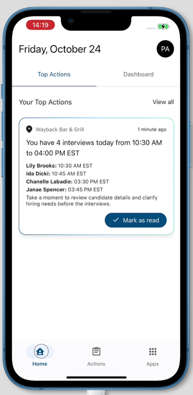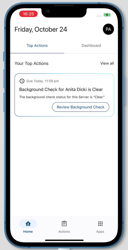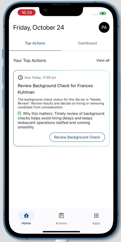 Select Review Background Check and then tap Hire to continue onboarding or Reject if not moving forward.