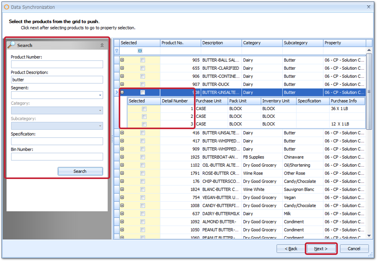 - Use the Selected column to select the product(s) and applicable detail number(s) to push to the property