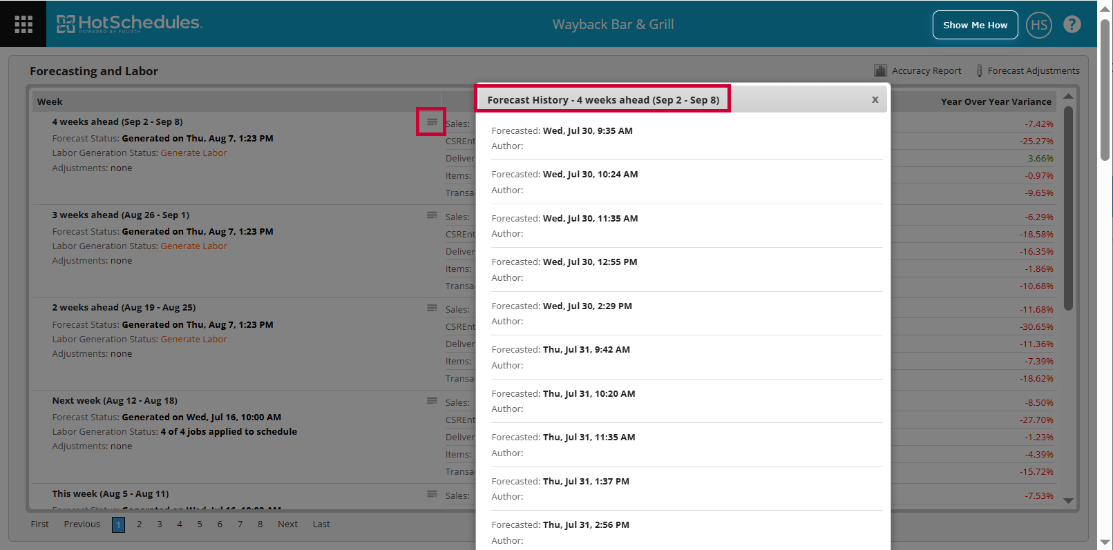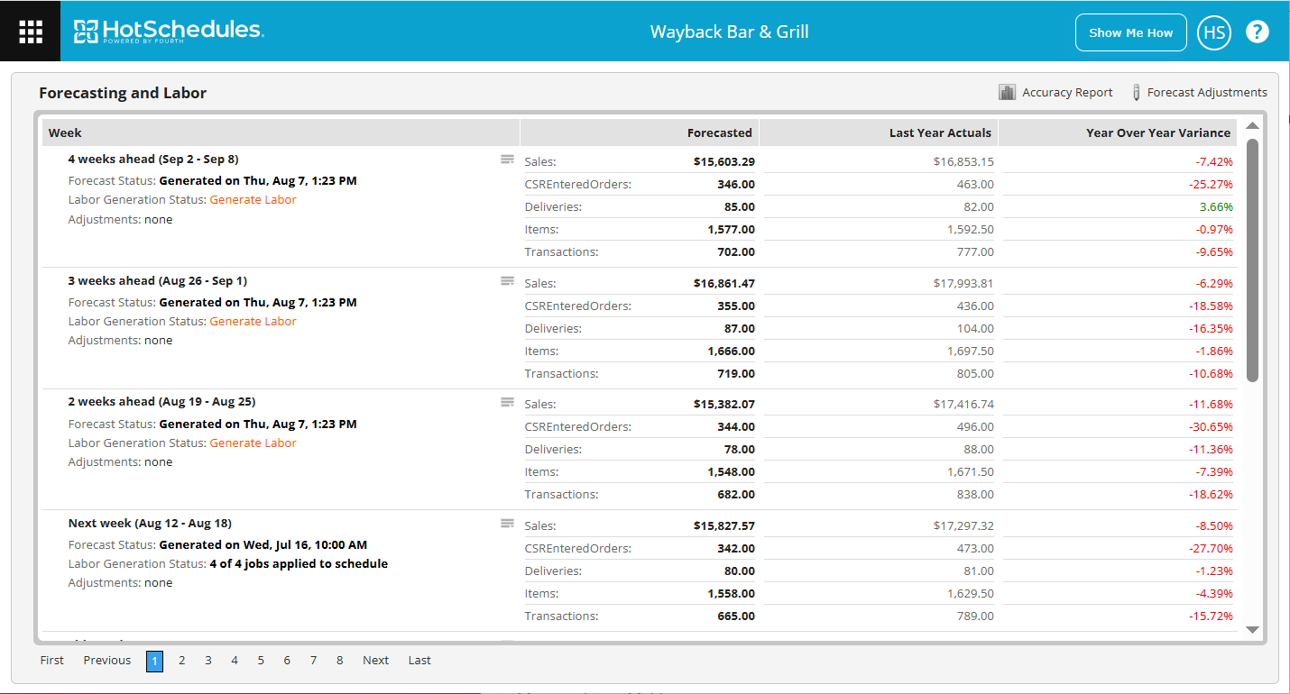 We highly recommend customers use the AI Forecast in conjunction with HotSchedules Labor Optimization tool. A forecast can only drive promised results when executed correctly. With Labor Optimization, your managers can automatically create schedules that meet the forecasted demand AND your labor rules, so they are always properly staffed and you’re operating at peak efficiency. This is called demand-driven scheduling.