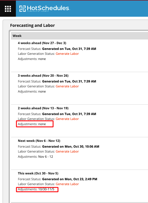 When an adjustment is applied, the Adjustment field will display details of the changes made to that forecasted week. If no adjustment is present, the field will display none.