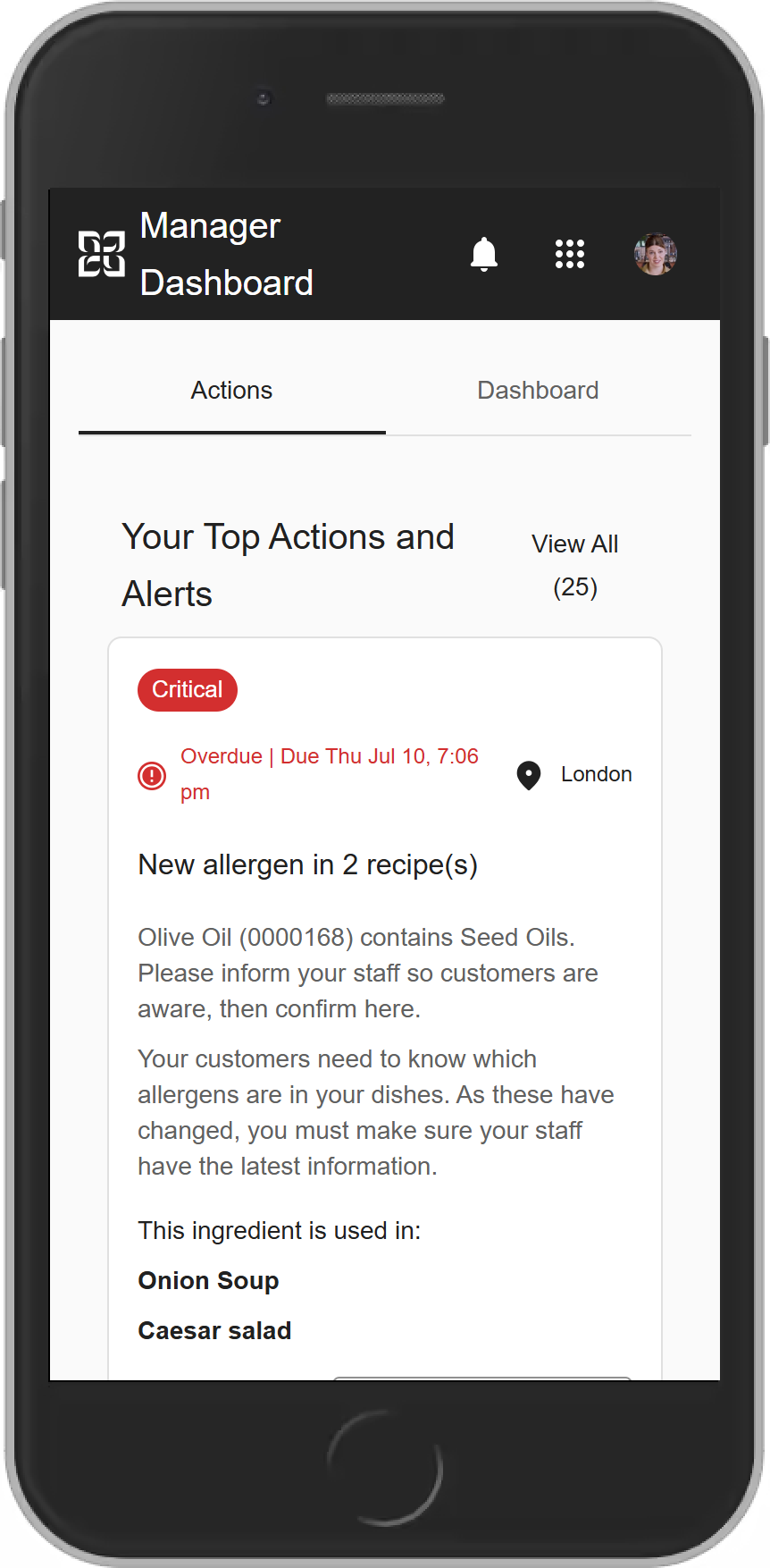 A critical Action showing the ingredient, the allergen and a list of impacted recipes from your location.
