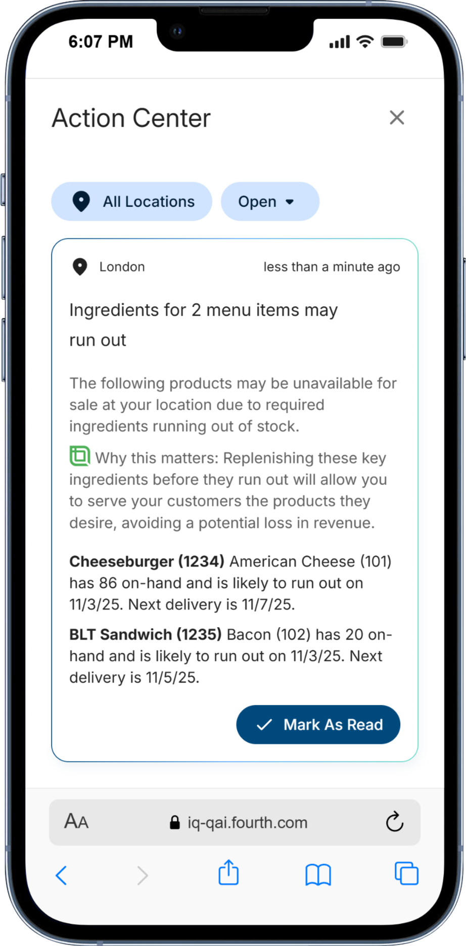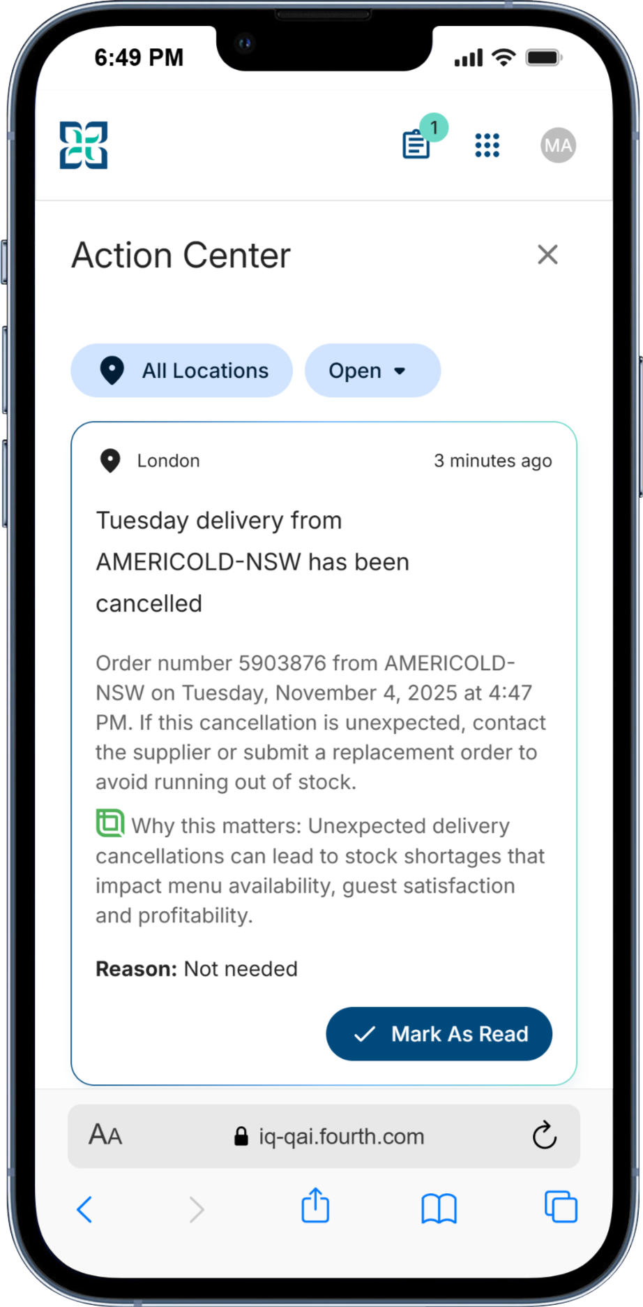 We are consolidating and streamlining a broad set of purchasing and inventory-related alerts and actions into the Manager iQ App, providing managers with a single, smart interface to stay informed about their operations and make timely, confident operational decisions. These alerts are available to all Fourth Inventory and MacromatiX customers (unless otherwise noted).