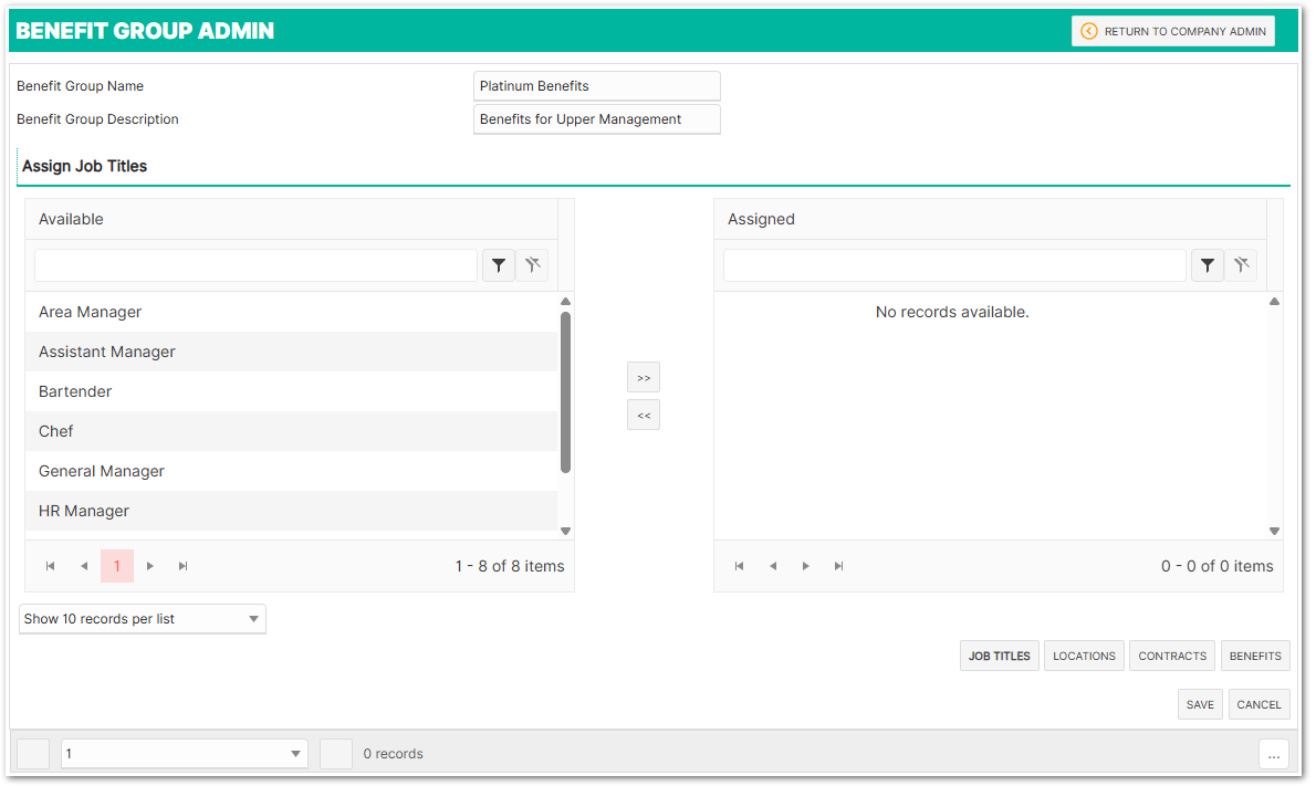 At employee level, users can assign any benefit that has been configured at company level, provided the employee belongs to that company and meets the criteria defined by Benefit Groups in place (if any).