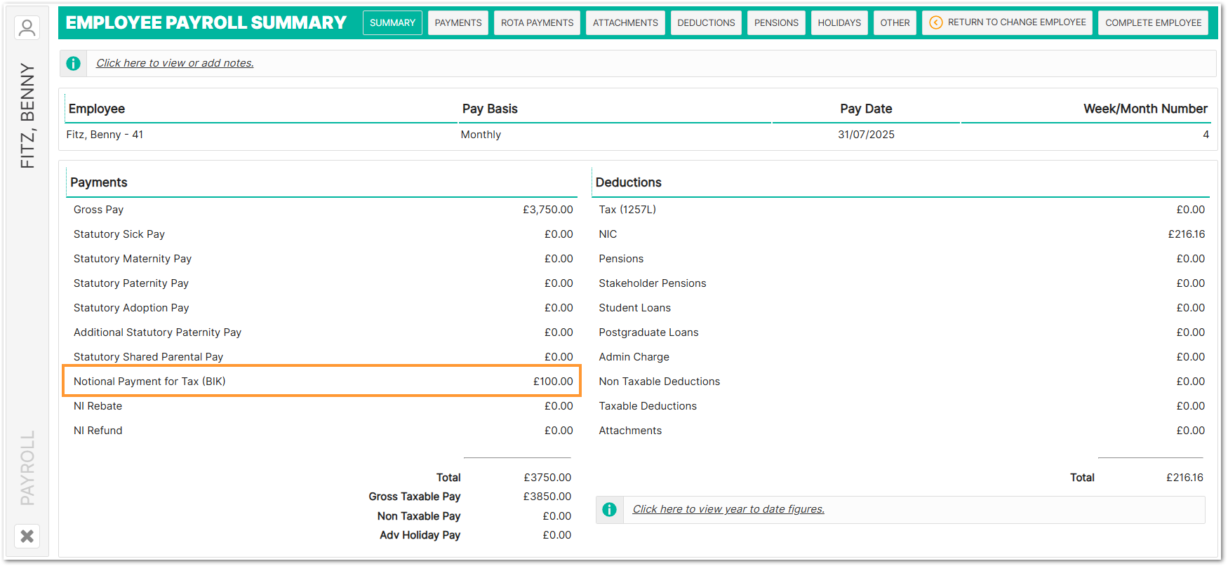 Once benefits are configured in the BIK module, the system automatically feeds the relevant tax liability into payroll as notional payments. These entries increase an employee’s taxable pay for tax and (after enhancements during 2026/2027) National Insurance purposes while never generating an actual payment.