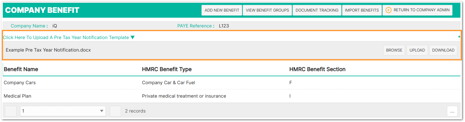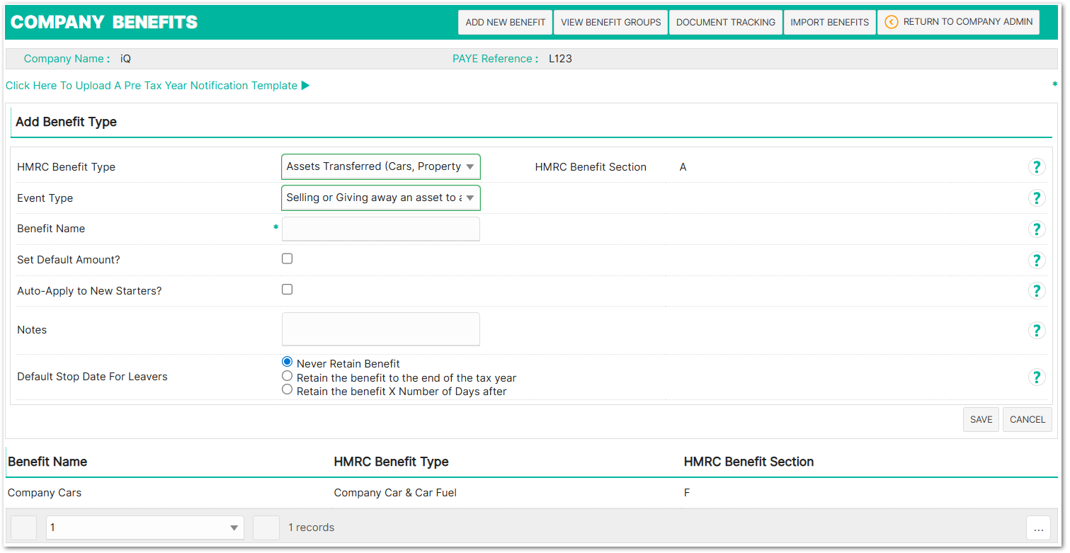 The 'Company Benefits' area is the foundation for payrolling benefits in the system. It includes every HMRC-defined benefit that can be payrolled for income tax purposes, and gives organisations a central place to activate, configure, and control how each benefit is handled.