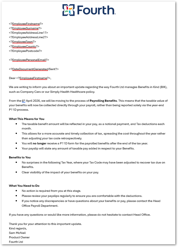 This is an initial placeholder function to assist with the transition. Over 2026/2027, Fourth will enhance this area to include broader communication handling, available employee communications, such as notifications confirming that the employer is payrolling benefits and the end-of-year Payrolled Benefits Summary, which will break down what was payrolled and how much tax was applied.