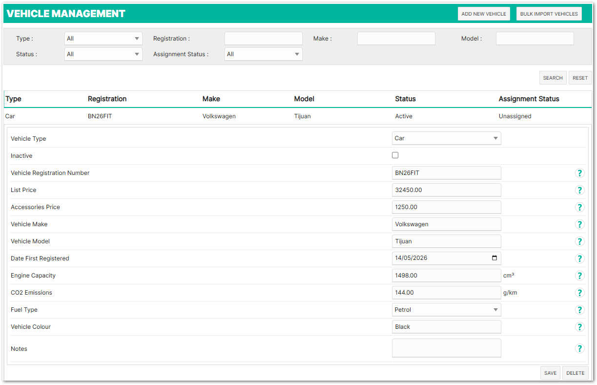 The 'Vehicle Management' area holds all data required for accurate car benefit calculations, including make and model, list price and accessories, CO2 emissions, fuel type, registration details, and other HMRC-relevant fields. Users will be able to enter and maintain this information manually.