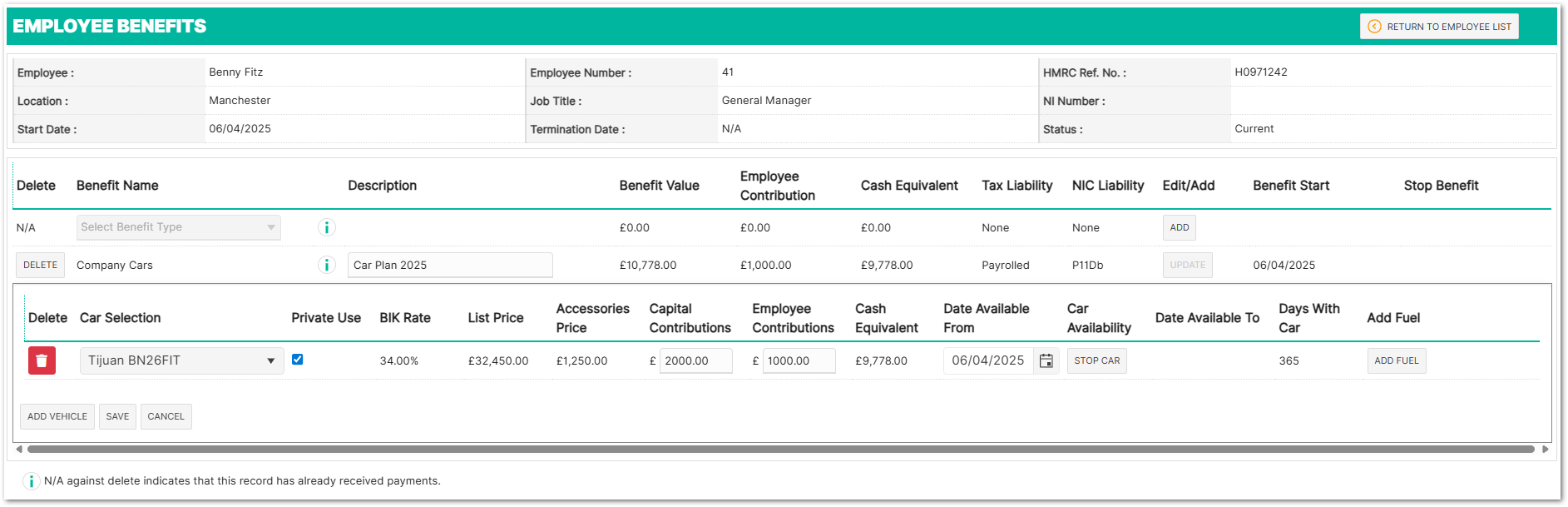 Car and car fuel benefits are treated differently. Their calculation rules are more complex, so they already have a dedicated interface that handles the vehicle record, assignment, contributions and pro rating in a structured way. This avoids manual workarounds and produces the correct taxable values without extra processing.