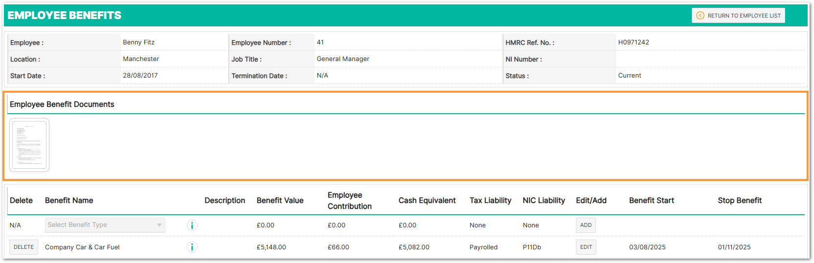 Within each employee’s BIK record, there is an 'Employee Documents' section. This shows all documents sent for that employee, giving users with access clear visibility of communications related to benefits. These documents will also be available to the employee in Employee Self Service (ESS).