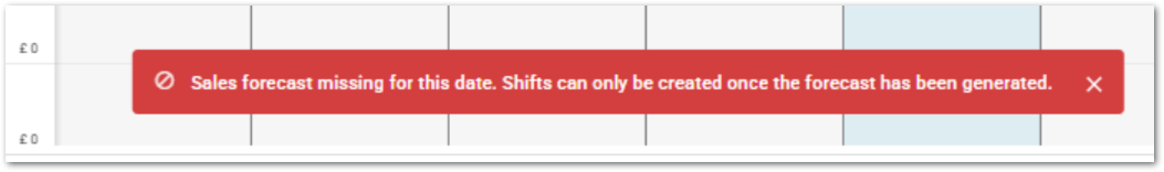 Only customers who use Fourth AI forecasting as the basis for Scheduling. If a user attempts to create a shift for a week where the AI Sales Forecast has not yet been generated (any date over 56 days into the future), the following message will appear: