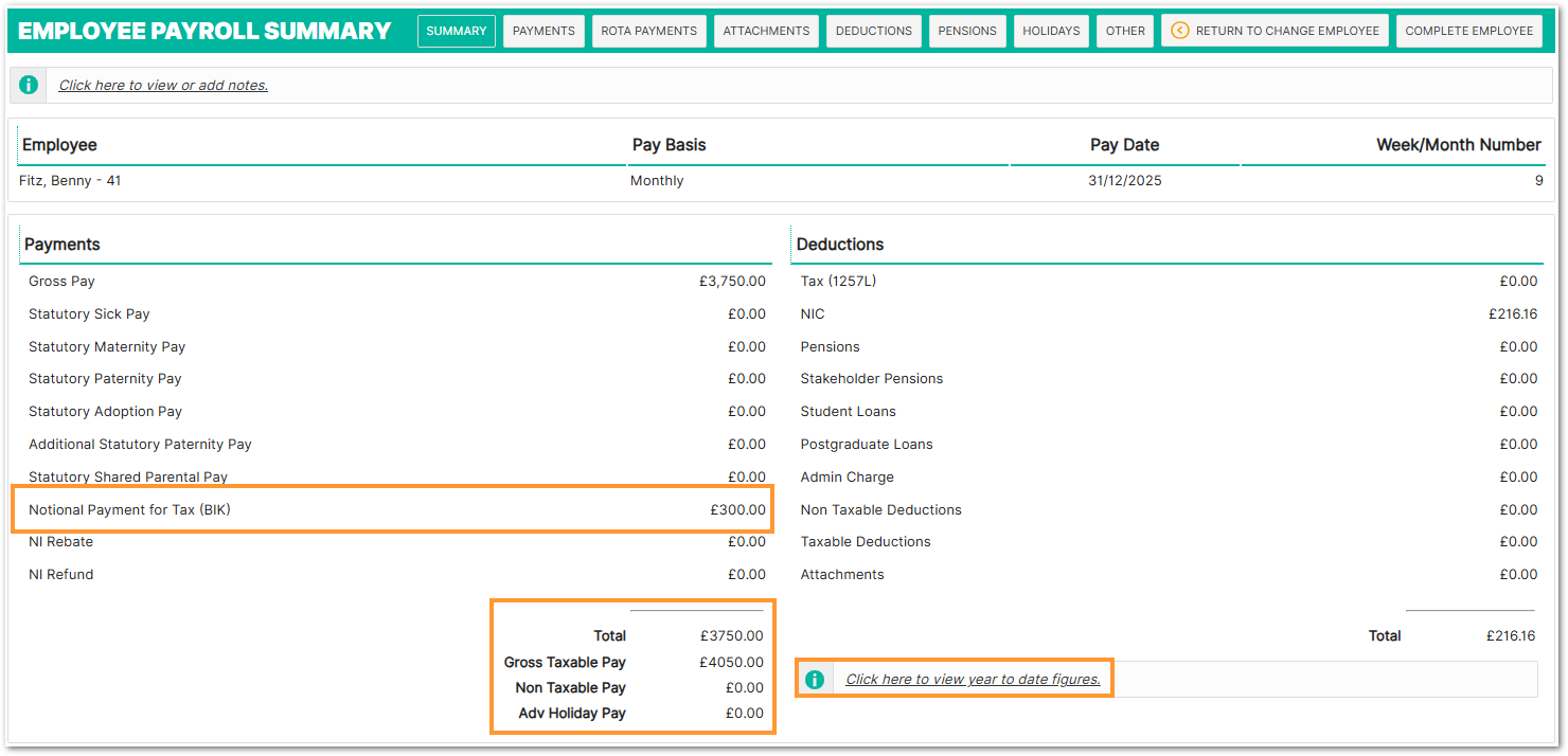 Employee Payroll Summaries display Benefit in Kind values as notional payments for tax purposes, allowing the tax calculation to correctly include the benefit value without affecting net pay.