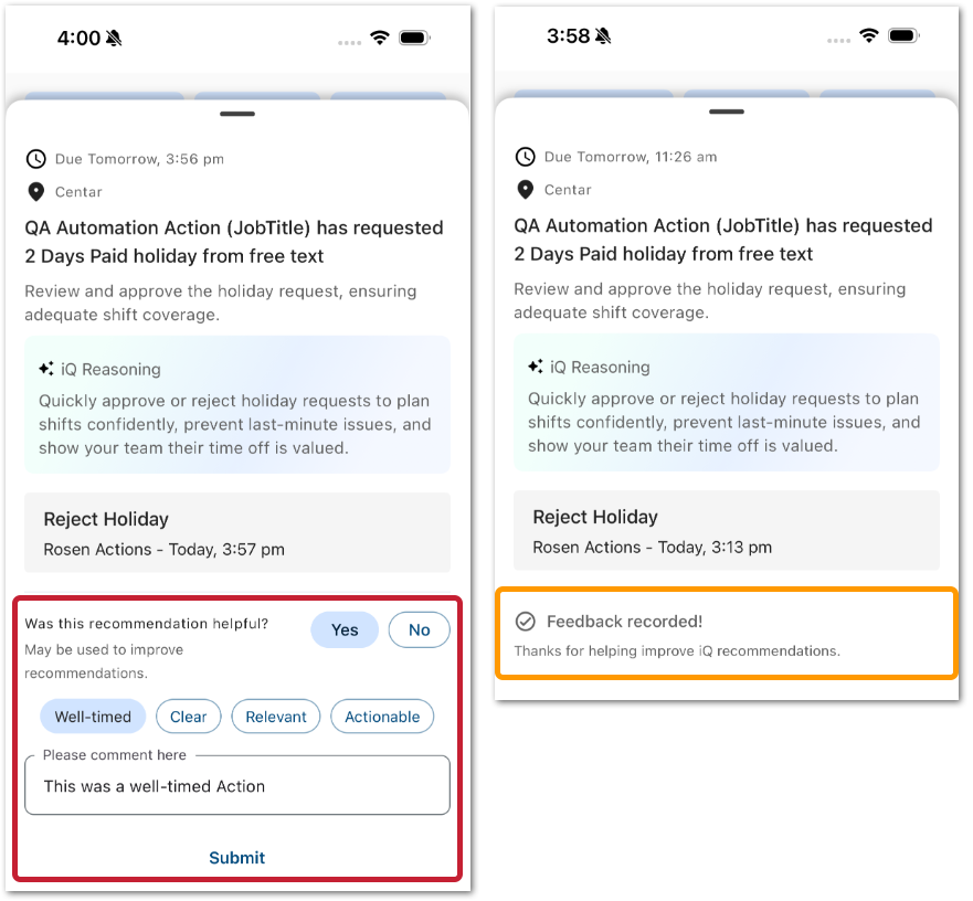 - Same familiar interface: Uses the same feedback flow as actions for consistency
